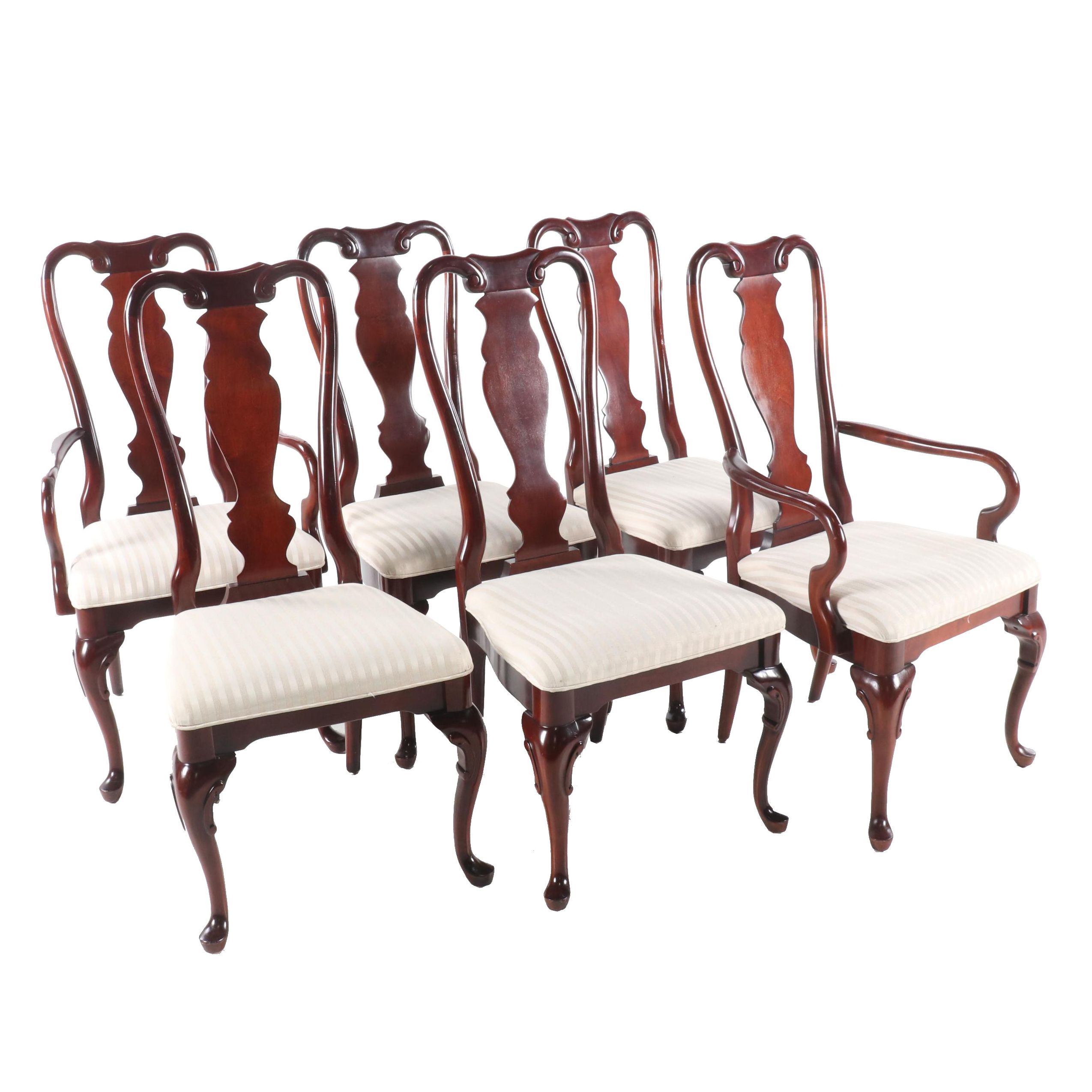 These pieces features a curved top rail with urn shaped splats rising on cabriole legs with two chairs features armrests.